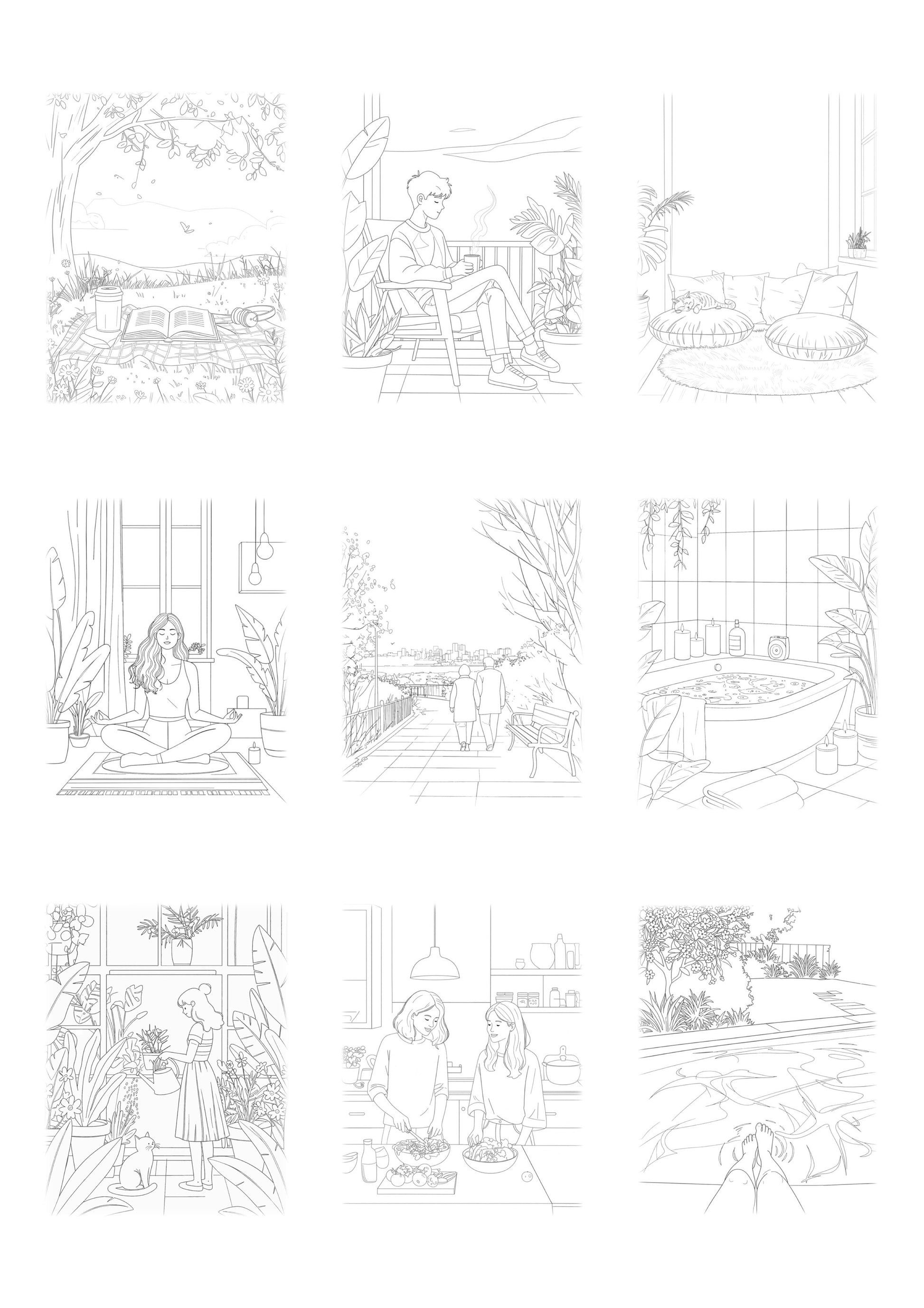 At the heart of the book, you’ll find 25 beautifully illustrated pages to color, featuring cozy and inspiring scenes. Otiuma’s aim is to offer variety so you can choose what to color based on your mood. Some illustrations are simple, others more detailed; some take place indoors, others outdoors. You’ll find pets, serene characters, and peaceful corners you can mentally travel to while coloring, finding balance and mental clarity.